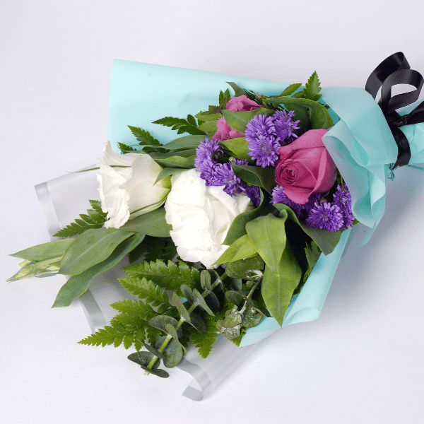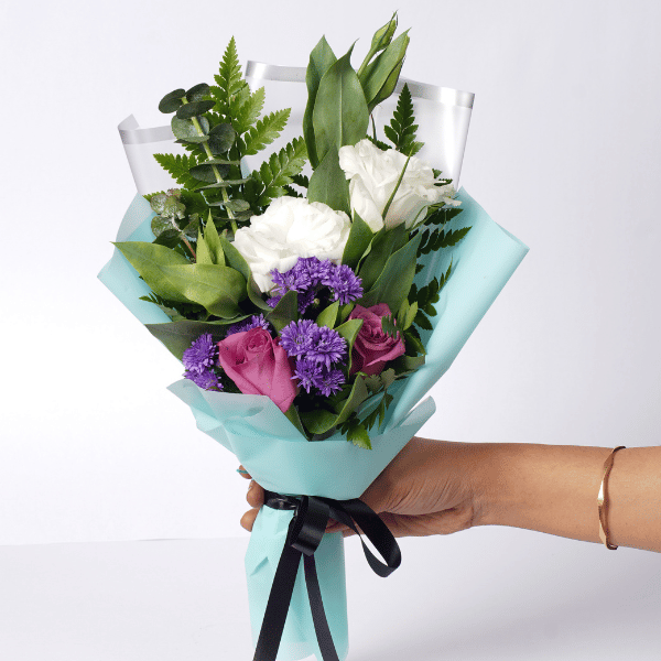 Discover the elegance of our beautifully arranged Floral Chirp mini bouquet, featuring soft gypsophila, delicate pink and white roses, charming daisies, and lush premium leaves. Wrapped in an elegant blue sheet, this bouquet is designed for thoughtful gifting. With its harmonious blend of colors and high-quality blooms, this bouquet makes a memorable statement.