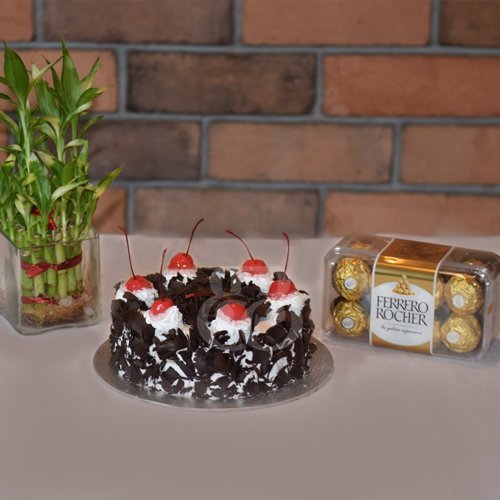 A classic flavor packed half kilogram Black Forest cake. A 3 layered special lucky bamboo plants. A 16 piece Ferrero Rocher box. Now this is a classical delight filled with chocolaty taste and luck. If this is not a sign of concern for your loved one then what is? Impress your loved one with this classic delightful combination of cake, chocolate and lucky bamboo plant.