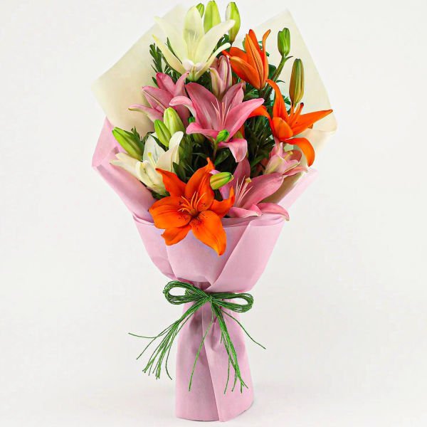 The luxurious and Vibrant bunch of 5 Blooming colorful Lilies wrapped in premium pastel pink hand made paper and a green ribbon bow for special occasions. This is a classic and vibrant floral bouquet with unmatchable aesthetics. Gift this to your loved ones and capture their expressions.